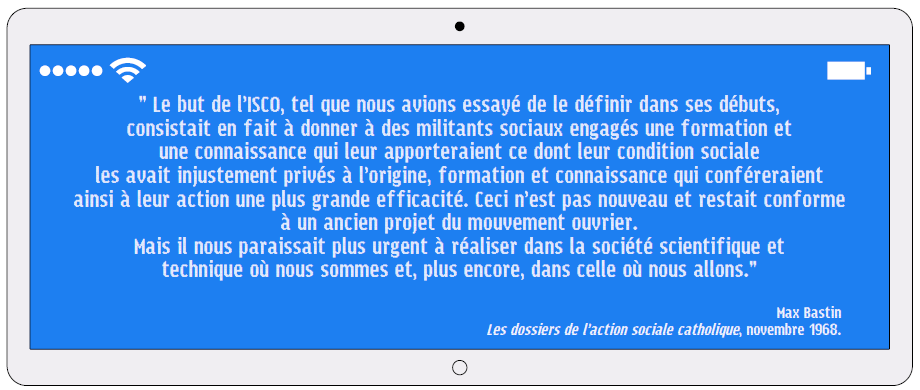 L’Institut supérieur de culture ouvrière (ISCO) concilie ces deux visions. Il cherche à associer émancipation culturelle et formation de cadre syndicaux. Le Centre d’information et d’éducation populaire (CIEP), fondé par le mouvement ouvrier chrétien, crée donc l’ISCO en octobre 1962. Son objectif est de former les travailleurs, les militants et les permanents d’organisation sociales ouvrières dans des disciplines sociales et économiques. L’ISCO veut donner une formation et une connaissance aux militants pour renforcer l’efficacité de leurs actions.