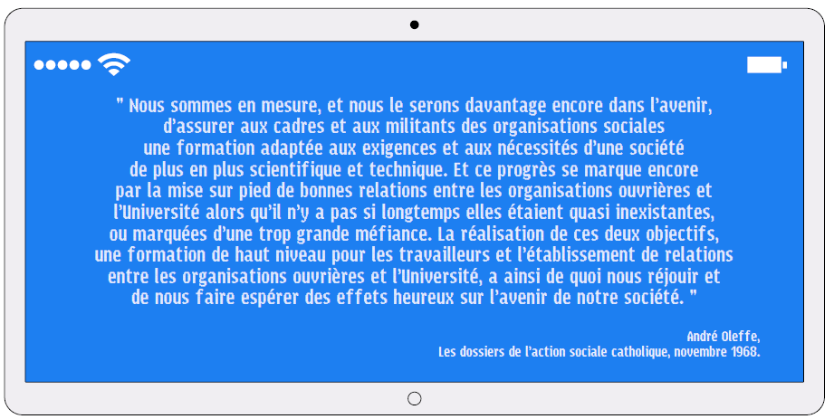La formation des travailleurs et des travailleuses est un enjeu démocratique qui évolue avec le contexte historique dans lequel elle s’inscrit. La signature du Pacte social en 1944 marque un tournant dans l’histoire de l’éducation populaire belge. À ce moment-là, représentants du patronat et représentants des travailleurs institutionnalisent les relations collectives en Belgique. À la volonté d’émancipation collective des travailleurs s’ajoute celle de former des interlocuteurs sociaux capables de négocier dans les organes de discussion paritaire. La création de l’Institut est le fruit de cette évolution.