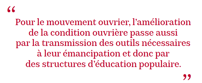 Si l’éducation populaire est absente dans la description des deux précédents sujets, elle n’en est pas moins l’une des composantes. Ainsi, Jean-Baptiste Godin déclare, dans son livre « Solutions sociales », que « Ce qu’il faut découvrir c’est l’éducation et l’instruction démocratiques ; c’est l’éducation et l’instruction pour tous les enfants du peuple, sans exception ; c’est la culture intégrale de l’esprit humain par la culture intégrale de l’espèce tout entière ; c’est enfin l’éducation et l’instruction conduisant tous les hommes à la vie utile et productive qu’il faut réaliser. ». Selon lui, l’instruction individuelle permet l’édification du bon travailleur et est donc nécessaire à la bonification collective. Du côté du mouvement ouvrier belge, l’éducation des travailleurs est vue comme un outil d’émancipation. Avec les émeutes de 1886, cette question prend de plus en plus place aux centres des réflexions. Elle fait l’objet d’importants débats méthodologiques sur le fait de porter ou d’apporter une éducation aux travailleurs et aux travailleuses. Ses actions en faveur de l’éducation populaire sont longtemps accompagnées de revendications sur la diminution du temps de travail, et donc sur l’augmentation de temps disponible pour la connaissance et la culture.