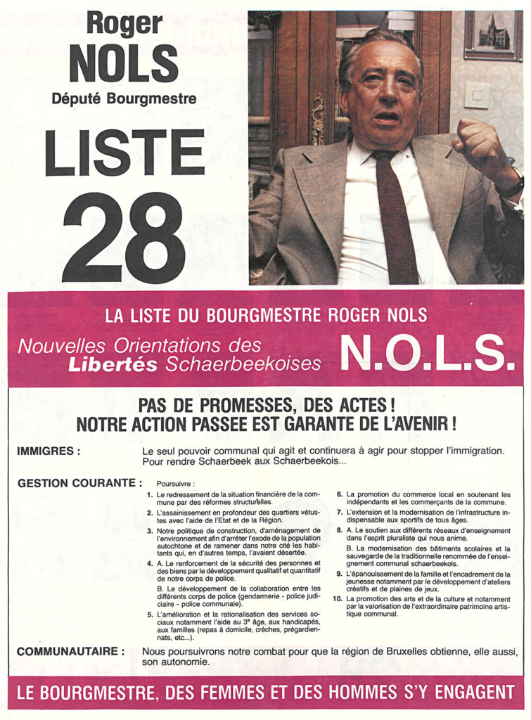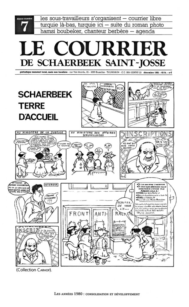 C’est face à l’adversité que se crée finalement la cohésion dans un contexte général de plus en plus difficile pour le travail social. Avec la crise économique, qui devient structurelle dans les années 1980, on assiste au durcissement des politiques migratoires. La loi instituant le code de la nationalité belge du 28 juin 1984, dite loi « », limite le regroupement familial et permet aux communes d’interdire de séjour certaines catégories d’étrangers. Schaerbeek applique rigoureusement la loi. Les politiques du bourgmestre libéral/FDF (Front démocratique des francophones), Roger Nols, connu pour ses positions racistes et xénophobes à l’encontre de la population migrante installée dans la commune, touchent de plein fouet le travail quotidien de l’asbl, bien qu’elle ne dépende pas de la commune, mais du national (puis du fédéral à partir de 1993), ce qui lui donne tout de même une « certaine liberté d’options de travail ». Avec les premières interruptions de paiement des aides sociales au CPAS de Schaerbeek (mars 1982), une deuxième fermeture du CPAS en juin 1985 ou encore la taxe-égouts (décembre 1985), la période voit une « ». Marie-Christine Renson ne s’occupe pas personnellement des dossiers, elle est d’abord engagée pour effectuer un travail social en lien avec les écoles primaires et maternelles du quartier, mais, face à ce contexte hostile, une ligne d’action commune se dessine au sein de l’institution. Cette période « militante » est marquée, pour Marie-Christine Renson, par la participation à « des luttes plus globales, des manifestations antiracistes. On a rejoint des mouvements plus macro, notamment syndicaux et autres… » C’est à ce moment-là qu’elle commence à « faire personnellement le lien avec l’histoire du mouvement ouvrier, les syndicats, les luttes ».