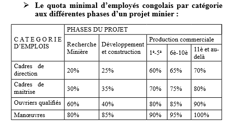 Selon la loi, les entreprises de l’industrie extractive doivent employer un certain nombre de personnes congolaises, et cela dans les différentes catégories d’emplois comme on peut le voir dans le tableau ci-dessous. Malheureusement, ces quotas ne sont actuellement pas respectés.