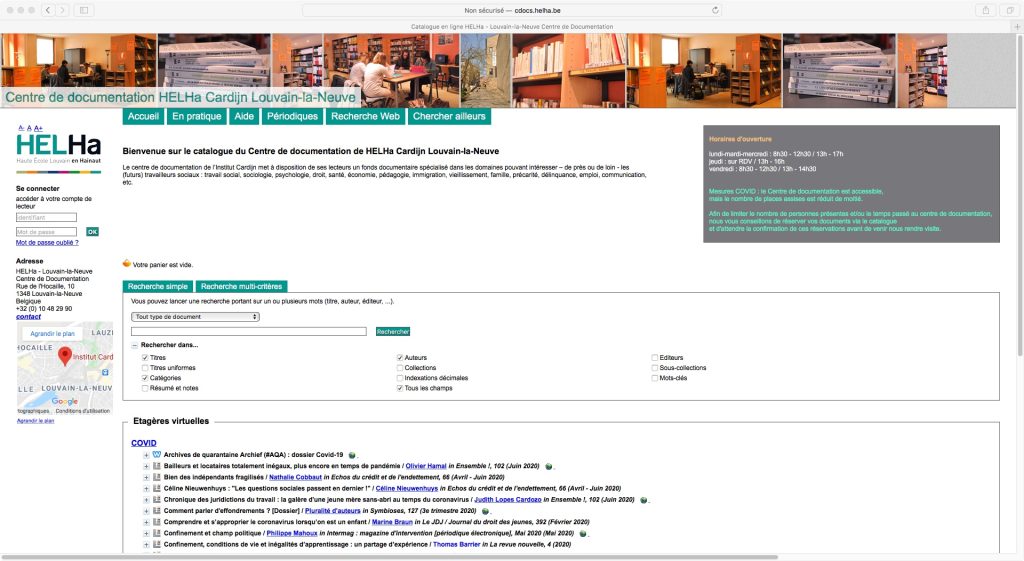 Page d’accueil du catalogue du centre de documentation de HELHA Cardijn Louvain-la-Neuve