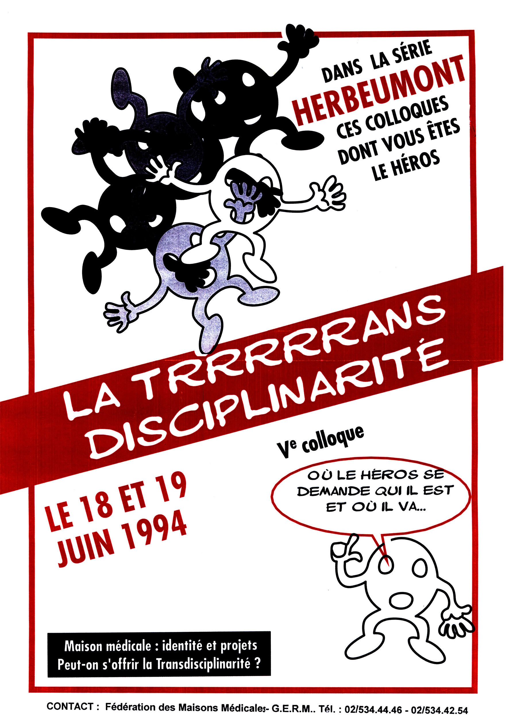 Affiche de promotion pour le cinquième colloque de la Fédération des maisons médicales, intitulé « La trrrrrans disciplinarité », 18 et 19 juin 1994 (CARHOP).