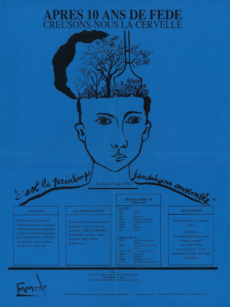 Affiche de promotion pour le premier colloque de la Fédération des maisons médicales, intitulé « Après 10 ans de Fédé, creusons-nous la cervelle », 9 et 10 juin 1990 (CARHOP).
