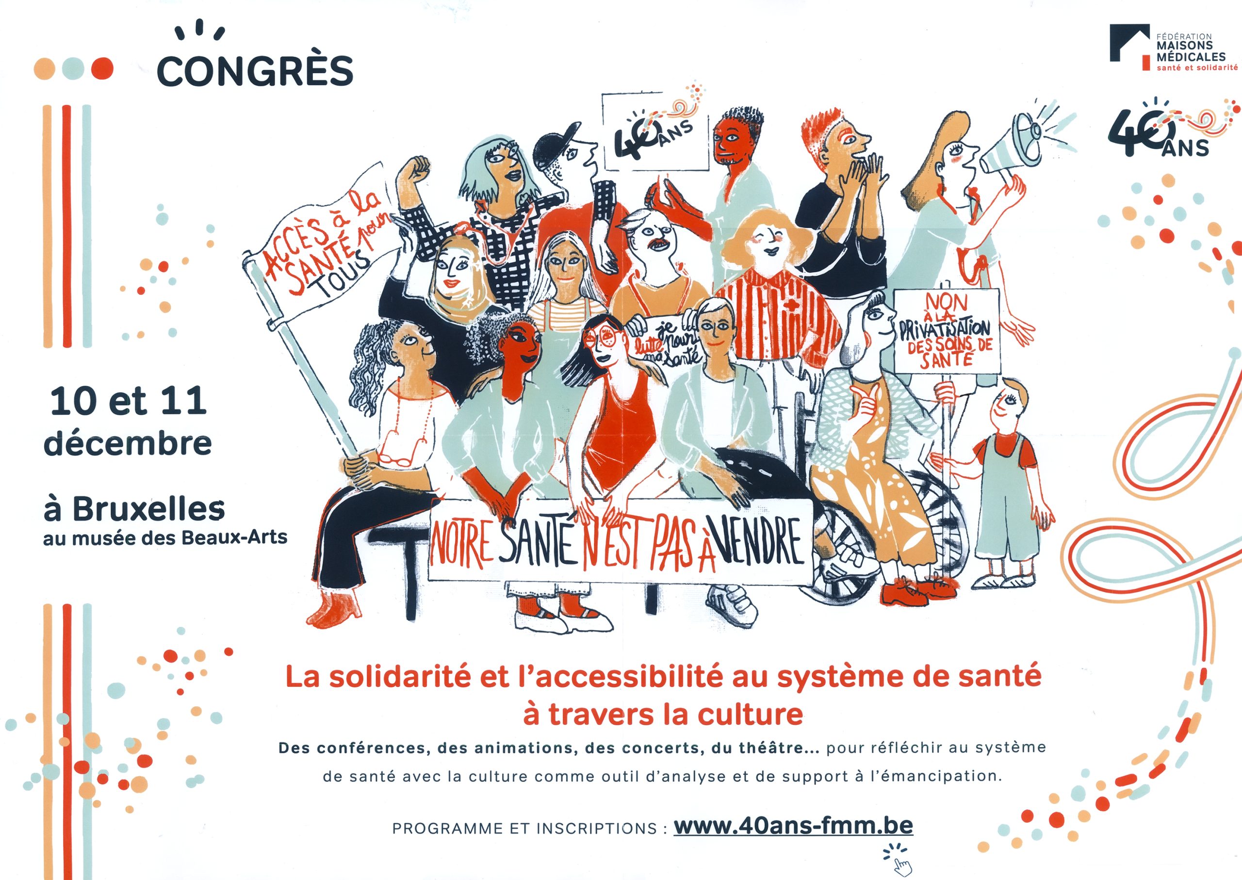 Affiche de promotion pour le congrès de la Fédération des maisons médicales, intitulé « La solidarité et l’accessibilité au système de santé à travers la culture », 10 et 11 décembre (sans date probablement 2020, reporté aux 10 et 11 juin 2022) (CARHOP).