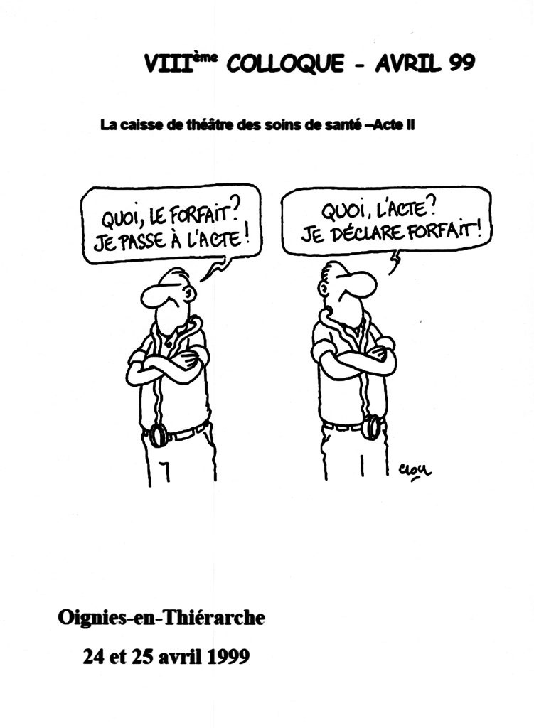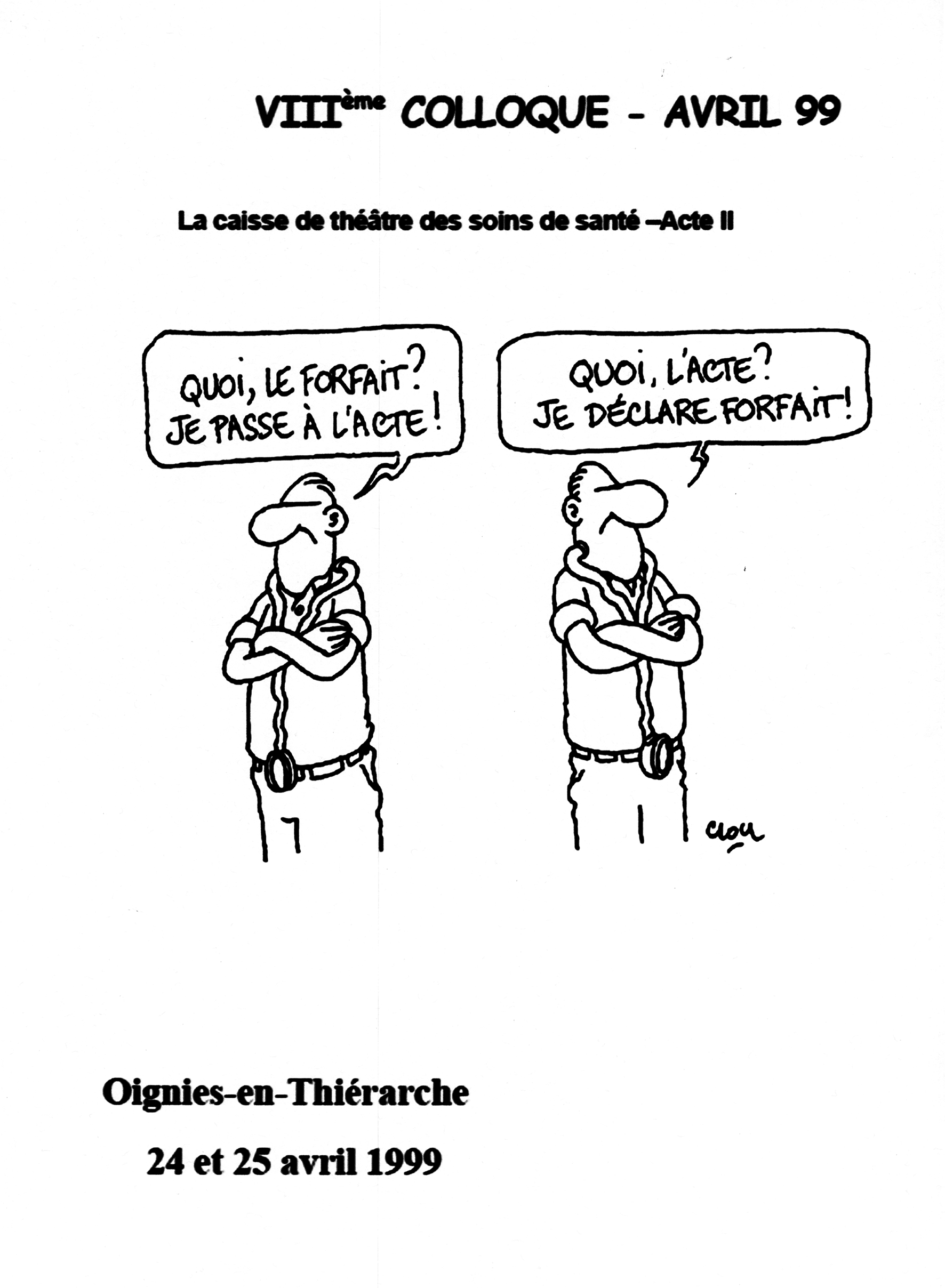 Affiche de promotion pour le huitième colloque de la Fédération des maisons médicales, intitulé « La caisse de théâtre des soins de santé – Acte II », 24 et 25 avril 1999 (CARHOP).