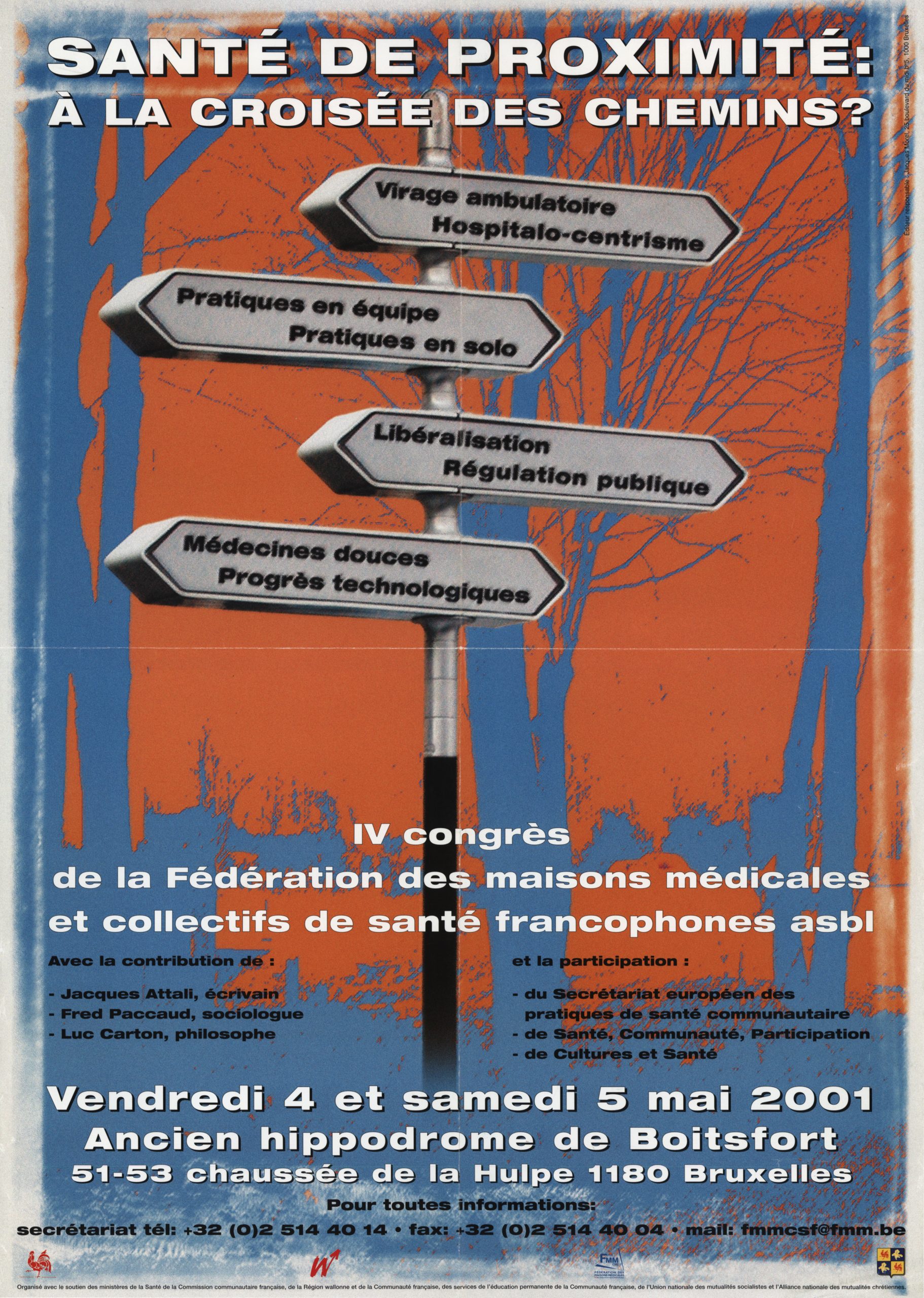 Affiche de promotion pour le quatrième congrès de la Fédération des maisons médicales, intitulé « Santé de proximité : à la croisée des chemins ? », 4 et 5 mai 2001 (CARHOP).