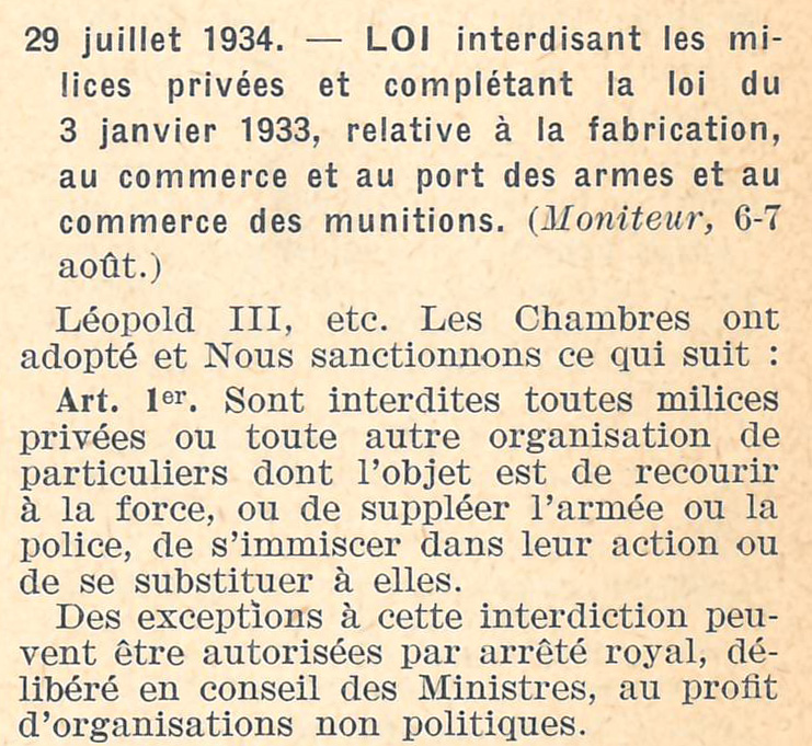 L’enjeu politique que l’État doit résoudre à travers ce texte innovant est essentiel : comment concilier les libertés d’opinion et d’association, d’une part, et le maintien de l’ordre public d’autre part ? Au nom de la défense de la démocratie et des institutions, la loi se veut radicale : toute milice privée ou toute organisation dont l’objet est de recourir à la force ou de suppléer l’armée ou la police, de s’immiscer dans leur action ou de se substituer à elles est interdite. Dans les faits, il semble qu’aucun mouvement ne tombe sous le coup de poursuites pénales ; en revanche, quelques condamnations individuelles sont prononcées envers des meneurs accusés d’avoir organisé des défilés aux allures militaires. La loi de 1934 aura peut-être eu son effet dissuasif, puisque plusieurs organisations sont dissoutes par leur parti de tutelle.[29]