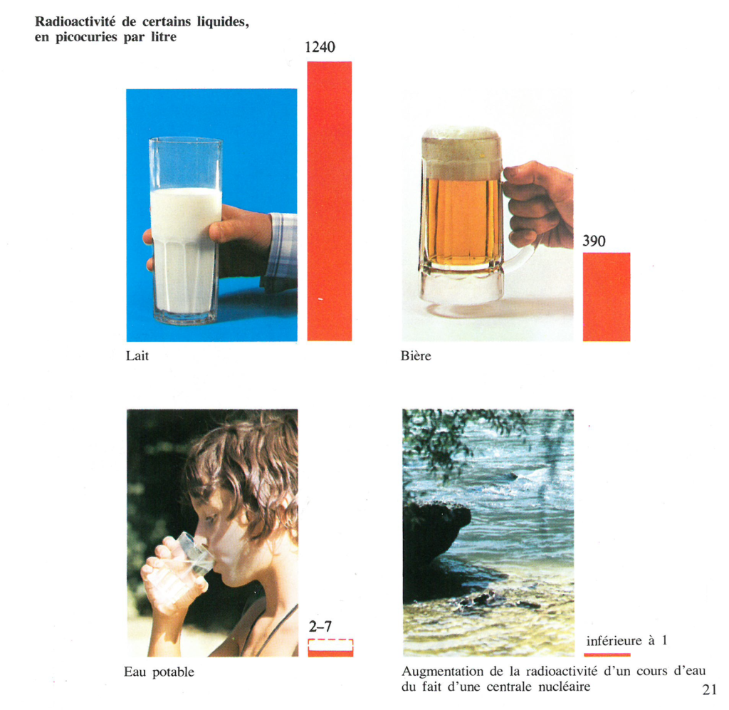 La problématique des radiations n’est pas oubliée, et le public lambda peut apprendre que la dose additionnelle maximale des radiations émises par les centrales nucléaires est plus faible que celles émises par le corps humain. C’est notamment pourquoi, « en se rendant à son travail, en allant faire des achats ou en vacances, une personne s’expose à des doses différentes de radiations naturelles, dont les variations sont plus élevées que la radioactivité additionnelle provenant d’une centrale nucléaire. »[23]