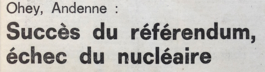 [30] Lambert G., Ohey, Andenne : Succès du référendum, échec du nucléaire, La Cité, lundi 2 octobre 1978, 28e année, N° 229, p. 1.