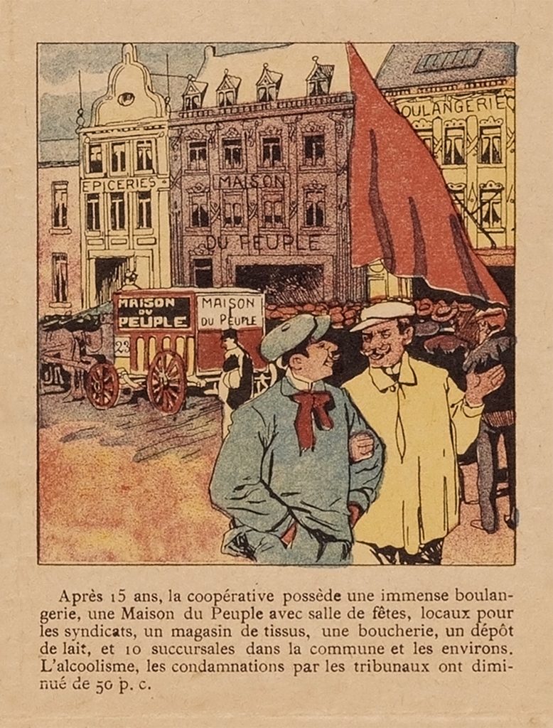Leurs puissances financière et logistique font des coopératives socialistes l’élément central du développement du socialisme belge. C’est à la maison du peuple, incarnation physique de la coopérative dans le paysage urbain, que les militant.e.s se réunissent, font du sport, écoutent des conférences, assistent à des spectacles, participent à des meetings, lisent les ouvrages de la bibliothèque, font leurs achats pour se nourrir et se vêtir, reçoivent des indemnités (en cas de naissance, de grève, d’accident, etc.). C’est la coopérative qui imprime les affiches électorales du parti, dont elle assure l’essentiel du financement. C’est elle qui soutient aussi logistiquement les mouvements de grève. L’émancipation des travailleuses et travailleurs portée par les coopératives est donc à la fois matérielle et intellectuelle. De surcroit, le mouvement coopératif se considère comme une alternative concrète au capitalisme et comme une manière d’en venir à bout par son caractère exemplatif et par l’extension progressive de son modèle économique. De manière générale, le mouvement socialiste belge, et particulièrement dans sa dimension profondément réformiste, ne peut donc se comprendre sans une connaissance de sa composante coopérative.