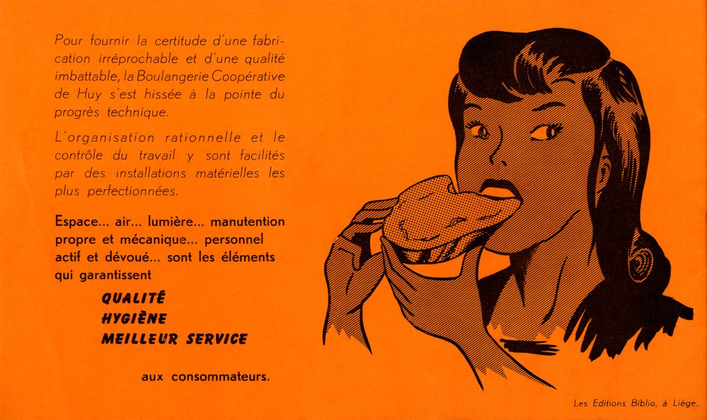 Illustration tirée de la brochure promotionnelle La boulangerie coopérative de Huy, Liège, Les Éditions Biblio, [ca 1950-1960] (IHOES, coll.).