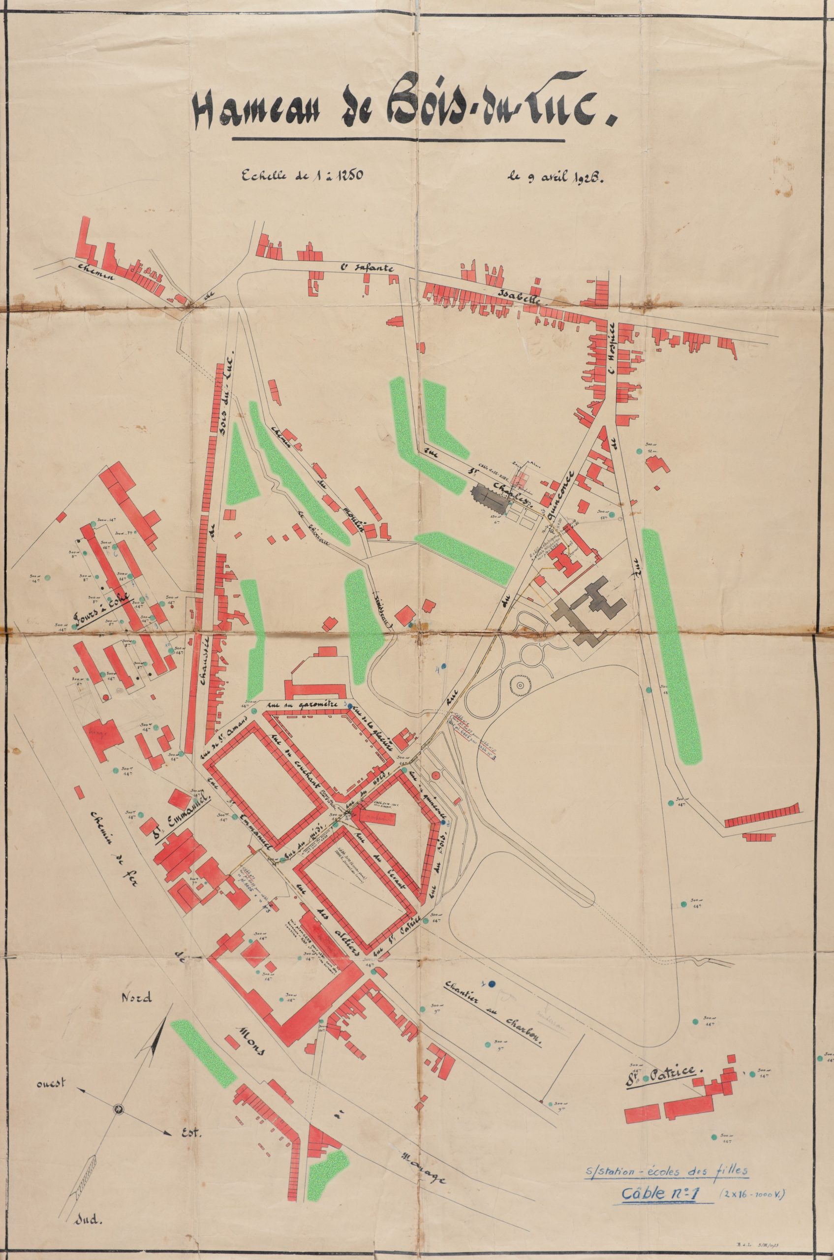 La cité du Bosquet ou « Bosquet-Ville », est donc érigée près du siège central, entre 1838 et 1853 ; elle est composée de 166 maisons réalisées selon un plan d’ensemble constitué de quatre blocs, deux rectangulaires et deux trapézoïdaux, séparés par deux axes perpendiculaires. Chaque bloc est formé de logements et la surface laissée libre au centre est réservée aux jardins. Si cette organisation de l’espace singularise Bois-du-Luc des autres modèles d’habitats ouvriers conçus à la même époque, il répond surtout à la volonté de construire un maximum de maisons dans un espace limité et cerné en partie par les installations industrielles de la société qui s’étendent de plus en plus.
