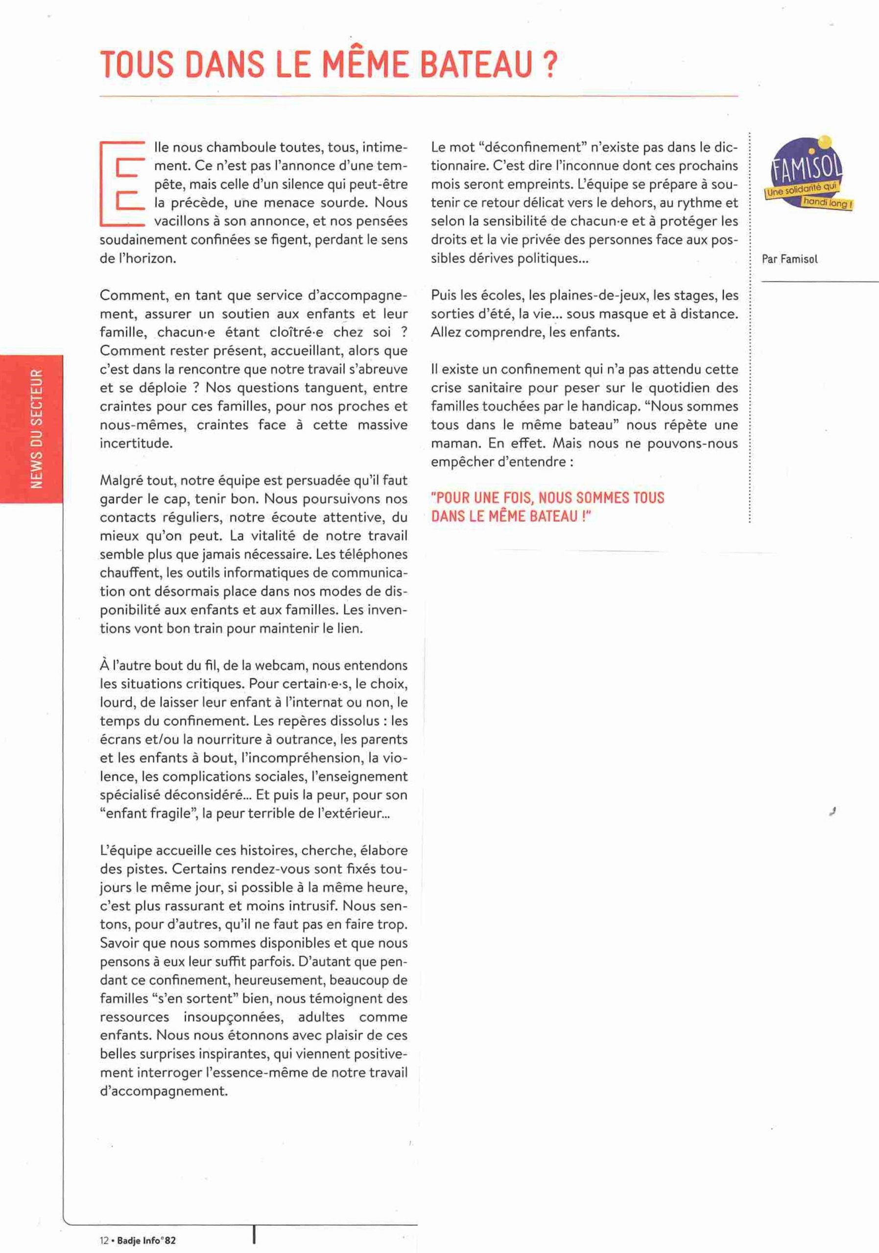 Au moment où nous terminons l’entretien, l’équipe de Famisol est dans une phase de reprise progressive du travail. L’aide sociale fait partie des secteurs qui ont rapidement mis en place le déconfinement. Les travailleur.euse.s sociaux.ales retournent sur le terrain, alors que le télétravail est encore pratiqué par beaucoup d’autres. Cette situation amène son lot de stress pour les accompagnateur.trice.s de Famisol. Les demandes d’adaptation sont permanentes, la réalité d’un jour n’est pas celle du lendemain, les consignes reçues se contredisent, les mesures de sécurité à suivre sont conséquentes et prennent du temps… La situation n’est pas confortable pour les membres de l’équipe, mais tous ont le plaisir de retrouver les enfants et les familles qu’ils accompagnent.
