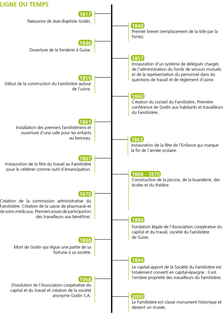 À partir de la fin de années 1850, Godin crée des organismes permettant aux ouvriers de s’exprimer sur des questions qui les concernent : logements, organisation de la production, santé et collectivité. Il commence par mettre en place un système de protection sociale en créant des caisses de secours protégeant contre la maladie, les accidents du travail et assurant une retraite aux plus de 60 ans. Il instaure également un système de délégués d’usine. D’autres initiatives suivent et permettent de renforcer le processus de participation des ouvriers. En 1880, huit ans avant sa mort, Godin crée la « Société du Familistère de Guise, Association du Capital et du Travail ». Les ouvriers deviennent actionnaires et participent à la gestion et aux décisions. Ils deviennent ainsi propriétaires de l’usine et du palais. La coopérative fonctionne jusqu’en 1968, moment où elle reprise par l’entreprise Eifel. Aujourd’hui, la fabrique Godin est une société anonyme et une partie des logements sont privatifs.