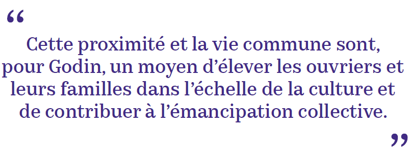L’ensemble architectural est pensé pour encourager les bénéfices de la vie en communauté. La proximité est un élément qui caractérise le Familistère. Celle-ci permet un accès rapide à l’usine et un gain de temps pour les ouvriers, ce qui facilite leur accès à la culture. Cette proximité et la vie commune sont, pour Godin, un moyen d’élever les ouvriers et leurs familles dans l’échelle de la culture et de contribuer à l’émancipation collective. Le Familistère est donc, non seulement un souhait d’émancipation sociale, mais aussi une façon de combattre l’individualisme et les dégâts de la révolution industrielle.