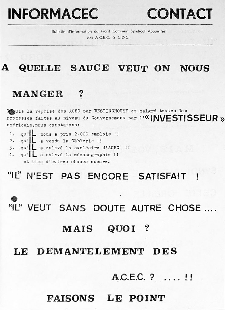De tout temps, l’emploi a été une préoccupation majeure des travailleurs des A.C.E.C. et chacun a encore en mémoire les longues et difficiles négociations menées en 1973 entre le gouvernement, la [Direction générale], Westinghouse et les organisations syndicales.