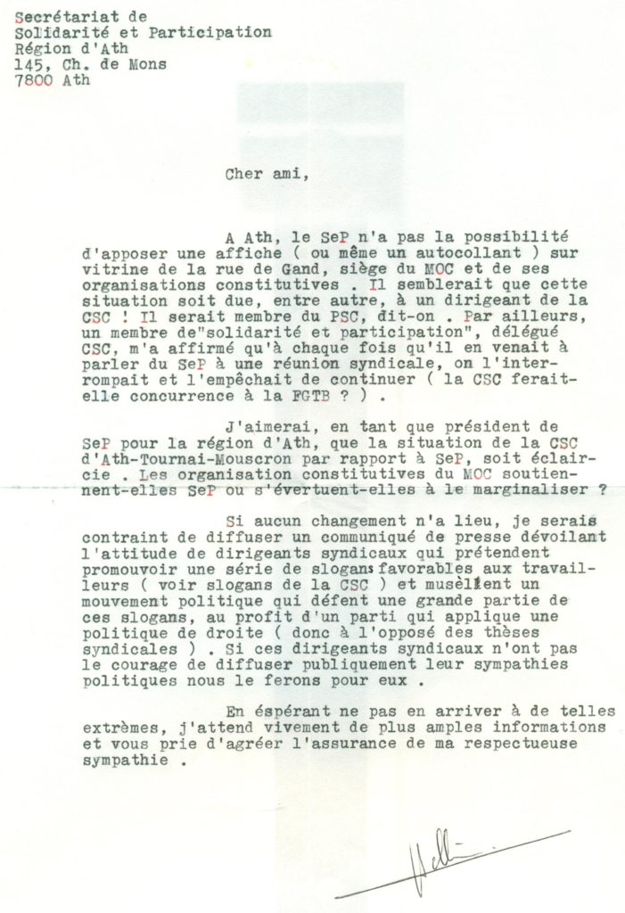 [49] Ce conflit à Ath témoigne d’une mauvaise compréhension du pluralisme institutionnel du MOC de la part des militant.es de SeP. Le président de la régionale rapporte que « le SeP n’a pas la possibilité d’apposer une affiche (ou même un autocollant) sur [la] vitrine de la rue de Gand, siège du MOC, et de ses organisations constitutives. Il semblerait que cette situation soit due, entre autres (sic), à un dirigeant de la CSC ! Il serait membre du PSC, dit-on ». Mais, le MOC Hainaut occidental peut-il légitimement apposer une affiche en faveur de SeP sans contrevenir au pluralisme institutionnel : sans doute, à la condition d’ouvrir cette possibilité à d’autres formations politiques, ce qui ne semble pas évoqué dans le document consulté. Du reste, les engagements des organisations se limitent au seul mouvement politique, et non au parti. Voir : CARHOP, SeP, n° 684 (classement provisoire), Lettre du secrétariat de SeP Ath au président de SeP, 1984.