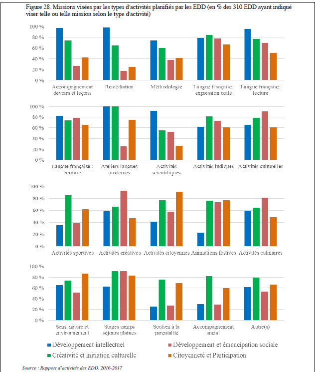Dominique Rossion et François Moors[30] ont fait une synthèse descriptive du travail, des publics, des activités et des relations avec l’extérieur des écoles de devoirs, basée sur l’ensemble des rapports d’activités des écoles de devoirs. Ils décrivent les diverses activités des 310 EDD, à savoir les activités en lien avec la sphère scolaire telles que 1° l’accompagnement aux devoirs, remédiation, méthodologie, maitrise de la langue française ; 2  les activités de type citoyen et soutien socio-éducatif large telles que soutien à la parentalité, activités citoyennes et accompagnement social, organisation des camps, plaines ou séjours ; 3  les activités transversales telles que activités ludiques, culturelles, sportives, créatives, culinaires, sensibilisation à la nature et à l’environnement et ce, en fonction des divers découpage du temps de vie : temps scolaire, temps extra-scolaire ou temps libre après école et le mercredi, temps des divers congés (congés de détente, vacances et grandes vacances).