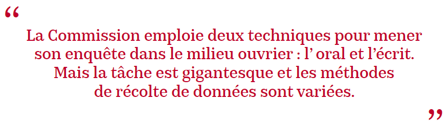 Les travaux de la Commission d’enquête s’étendent entre avril 1886 et juin 1887. La Commission emploie deux techniques pour mener son enquête dans le milieu ouvrier : l’oral et l’écrit. Mais la tâche est gigantesque et les méthodes de récolte de données sont variées.