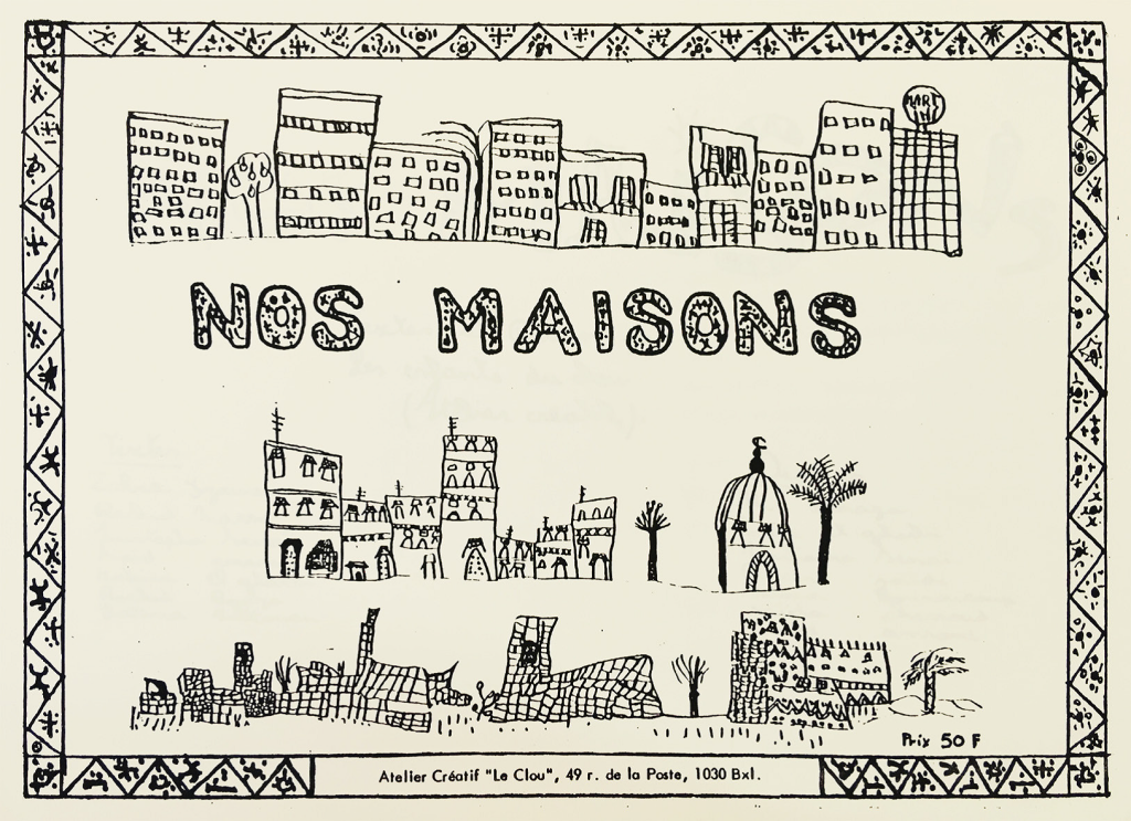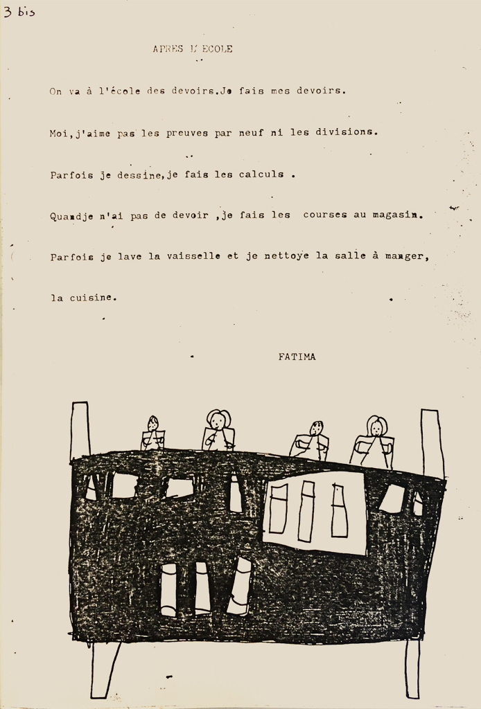 Elle apporte également un témoignage sur les activités d’Hypothèse d’école des années 1981 et 1982, une période pour laquelle nous avons peu d’éléments. Par contre, la collaboration souhaitée avec les instituteur.trice.s ne se fait pas. Lors des rencontres qu’elle organise, elle découvre une profession désarmée face à des classes surpeuplées, fréquentées par des enfants qui ont des niveaux très variables et des problèmes d’apprentissage quasi insolubles. Certain.e.s sont désabusé.e.s et laissent passer. D’autres font face et cherchent des solutions, sans beaucoup de soutien au sein de l’école. L’étudiante concentre aussi son attention sur l’approche culturelle du milieu des enfants en privilégiant la rencontre avec les parents et rédige des petites monographies sur les familles. Elle évoque le choc culturel entre elle et le milieu. Comme future travailleuse sociale, c’est un apprentissage. Ses analyses des difficultés rencontrées par chaque enfant qu’elle accompagne sont autant d’arrêts sur image sur des habitants d’un quartier du Botanique, à un moment donné, en 1980. Ses annexes publient les projets des enfants dans le cadre de l’atelier créatif : leur journal de bord, la correspondance avec une classe d’enseignement spécial à Malmedy, les carnets de présentation de leur quartier et de leur manière de vivre à Saint-Josse et au Maroc : « Nos maisons », « le Marché du Midi », etc. Ce sont sans doute les seules traces de ces réalisations collectives !