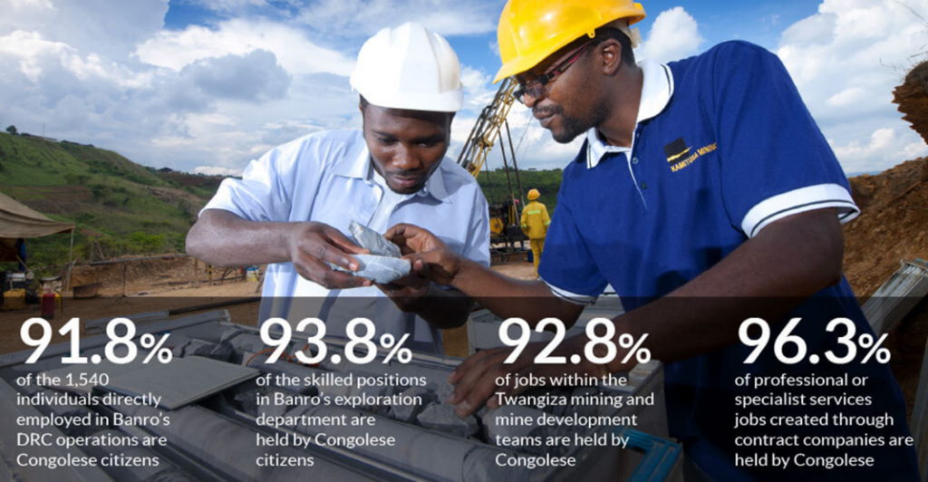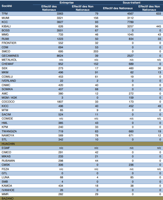 Les projets des grandes entreprises minières sont intensifs en capital et en technologie, et utilisent peu de main-d’œuvre. . Le tableau montre les effectifs des nationaux et étrangers dans les sociétés minières et pétrolières, ainsi que dans les sous-traitances. On constate qu’au total, les entreprises minières créent presque 80 000 emplois, dont presque 50 000 directs, et 30 000 à travers les sous-traitances. L’entreprise Tenke Fungurume (TFM), située à Fungurume, dans la province du Lualaba, dans la partie sud-est de la RD Congo, occupe la première place sur la liste. TFM emploie 3 442 personnes directement, dont presque toutes sont des nationaux. Mais il faut savoir que cette entreprise est la plus grande entreprise cuprifère du pays. Dans les années 1970, à l’apogée de la Gécamines, principale société minière à l’époque, celle-ci employait environ 33 000 personnes. La différence est notable.