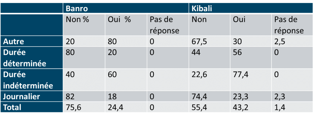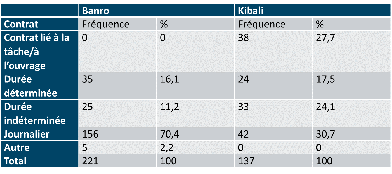 Le tableau suivant présente quelques données relatives aux contrats : dans les sous-traitances de Banro, 70 % de nos enquêtés sont des journaliers. Dans Kibali Gold, c’est 30 % de journaliers, et 27 % d’autres personnes ont des contrats liés à la tâche. Pour les contrats à durée indéterminée, les pourcentages sont respectivement de 11 % et 24 %.