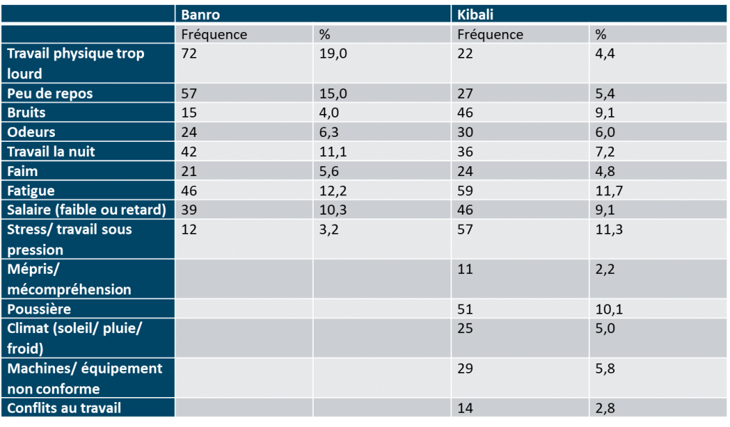 Deuxième constat : Le travail dans les mines peut être pénible et dangereux. 79 % des enquêté.e.s dans les différentes concessions disent parfois travailler dans des conditions désagréables, alors que 74,8 % disent faire face aux risques pendant le travail chez Kibali, et 76,9 % chez Banro.