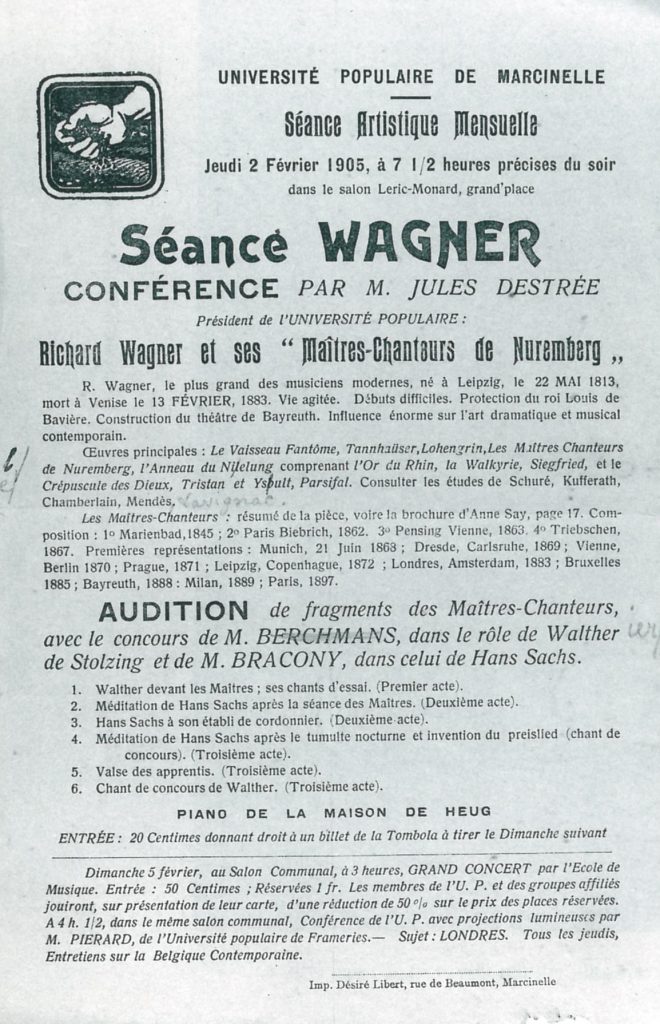 L’Université populaire de Marcinelle, inaugurée en 1904, est une initiative de Jules Destrée, échevin de l’Instruction publique de cette commune. Comme les universités populaires de Schaerbeek, de Saint-Gilles ou de Mons, elle s’appuie sur ces devancières et sur le modèle français et va développer de multiples activités de tout ordre.