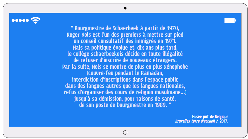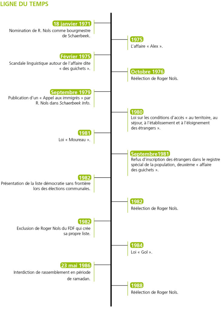 Roger Nols devient bourgmestre de Schaerbeek en 1971. Né en 1922, il est élu au Conseil communal de Schaerbeek en 1956. Puis, à l’occasion des élections législatives et provinciales du 23 mai 1965, il rejoint les listes du Front Démocratique des Francophones, le FDF. Devenu bourgmestre de la commune, il le reste jusqu’en 1989. Ses mandats successifs sont traversés par des scandales et des conflits de plus en plus fréquents et xénophobes. En réaction, un tissu associatif et citoyen se rassemble et s’organise à Schaerbeek pour contrer les discours et les politiques de Roger Nols.