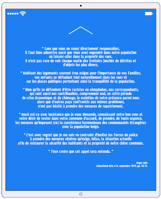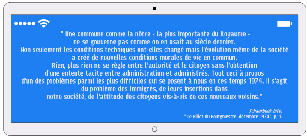 À partir de 1974, les discours de Roger Nols tendent de plus en plus à faire de l’immigration un combat politique et électoral. Il décrit les étrangers comme étant structurellement et intrinsèquement, de par leur culture et leurs habitudes, incompatibles avec la société belge. Pour lui, ils sont la cause potentielle ou effective des problèmes socio-économiques de la commune de Schaerbeek. Accentuant les enjeux sécuritaires, il les accuse d’incapacité à prendre place dans la société belge, voire de violences. Ces discours ne se basent sur aucune donnée scientifique vérifiable et rentrent dans une dynamique raciste. Ainsi, ils reposent essentiellement sur des stéréotypes qui stigmatisent les individus et, ce faisant, les séparent. Selon Roger Nols, il y aurait un « eux » et un « nous ». Cette pensée atteint son paroxysme en 1979, avec la publication d’un « Appel aux immigrés » pour le bulletin communal Schaerbeek Info.