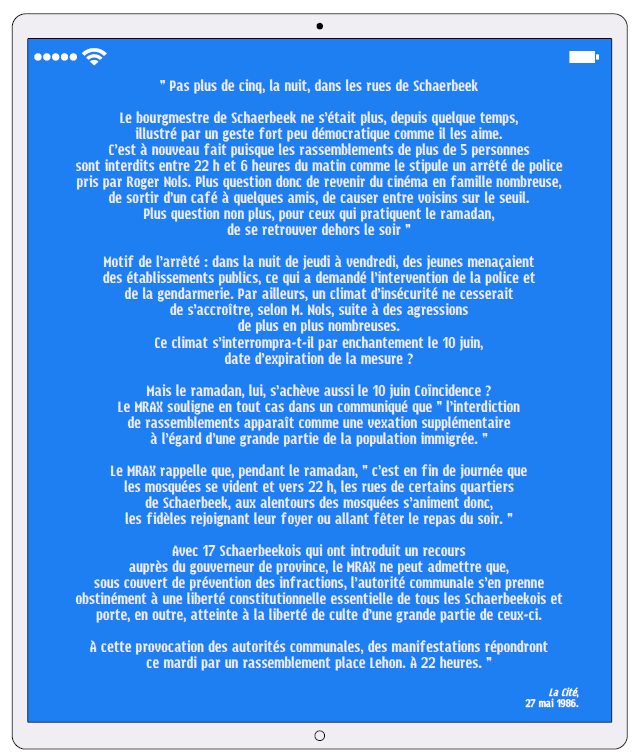 La situation reste délétère pendant des années à Schaerbeek. En témoigne l’exemple qui permet d’introduire ce sujet. En 1986, Roger Nols interdit des rassemblements de plus de cinq personnes entre 22 heures et 6 heures du matin.