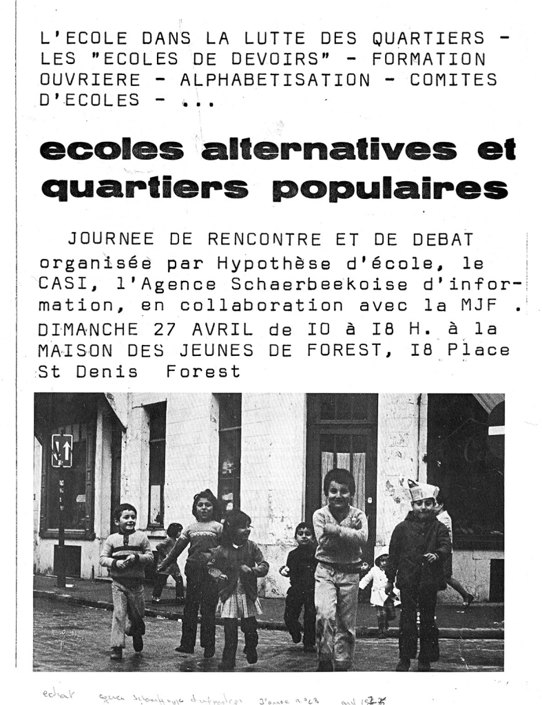 Le 27 avril 1975, se tient à la Maison des jeunes de Forest une première rencontre autour de la problématique des « Écoles alternatives dans les quartiers populaires ». L’initiative est portée par Hypothèse d’école (HE), l’Agence schaerbeekoise d’information (ASI), le Centre d’action sociale italien – Université ouvrière (CASI-UO). La Maison des jeunes de Forest met ses locaux à disposition et prend en charge l’animation de la soirée. Une affiche annonce l’évènement. Elle est largement diffusée via les réseaux et les bulletins des associations à l’origine de l’initiative.