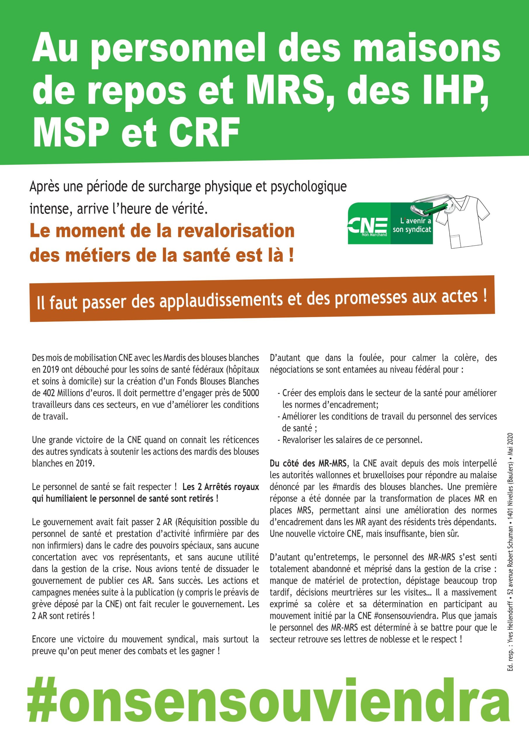 Le déconfinement entame sa première phase le 4 mai 2020. Alors que les organisations syndicales entendent poursuivre en faveur de la revalorisation des métiers du secteurs des soins de santé, c’est le jour choisi par la ministre de la Santé, la libérale Maggie De Block, pour publier dans Le Moniteur deux arrêtés royaux qui vont provoquer l’ire des syndicats : l’un autorise la délégation d’actes infirmiers à d’autres professionnels de la santé, l’autre permet la réquisition du personnel. C’est un camouflet envers celles et ceux qui s’investissent corps et âme depuis le début de la pandémie. La CNE lance une action de protestation. À défaut de manifester dans les rues, le personnel est appelé à se photographier avec des affiches de protestation et à les publier sur les réseaux sociaux sous le hashtag « #onsensouviendra ».
