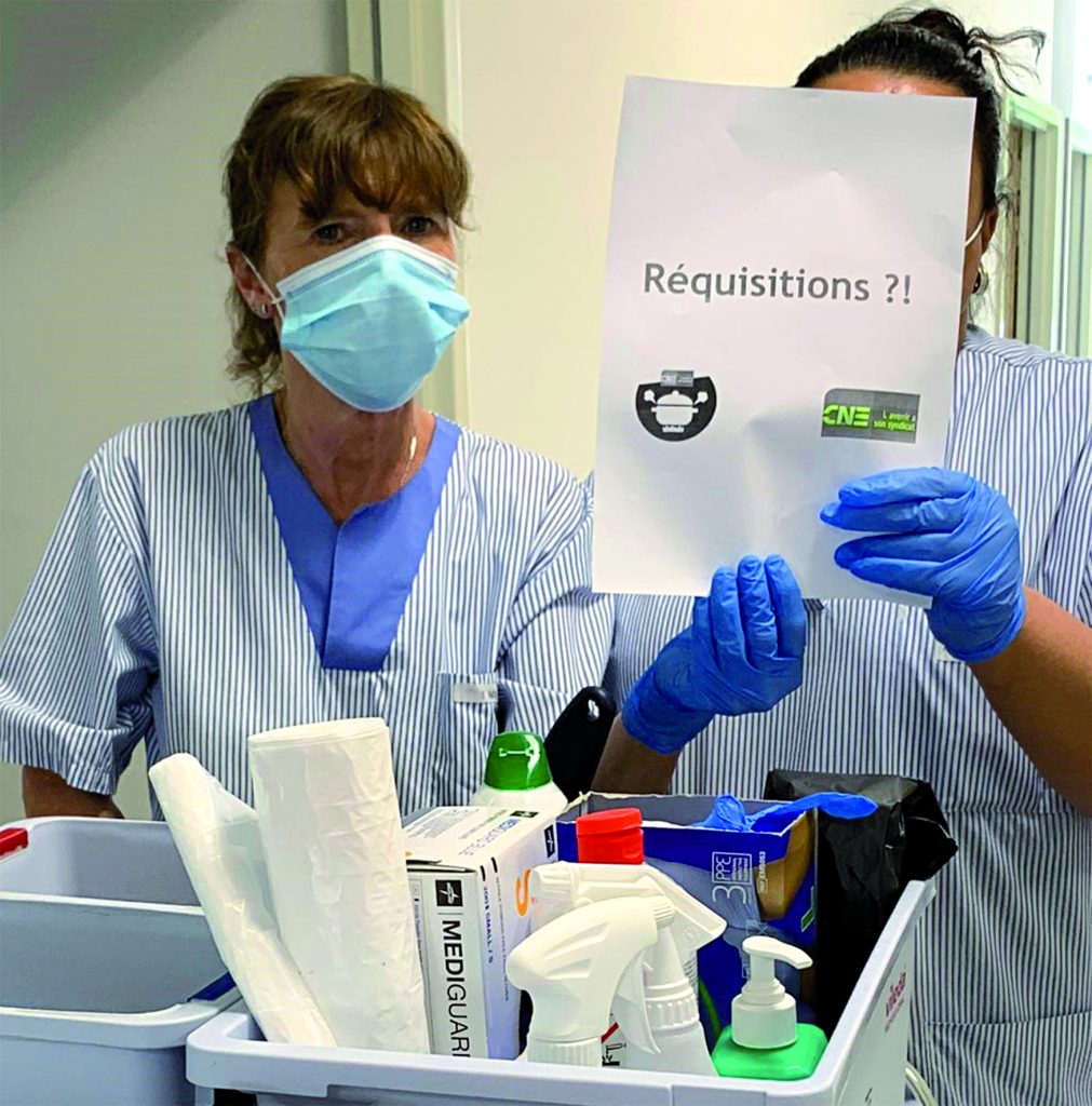 Les premiers témoignages dénonçant les conditions de travail du personnel de première ligne affluent auprès des déléguées et délégués de la CNE dès le début du mois de mars, plusieurs jours avant le début du confinement. Les milieux hospitaliers sont confrontés à un manque de matériel de protection (masques, blouses, charlottes…), une procédure en matière d’encadrement des malades de la Covid-19 fait défaut.